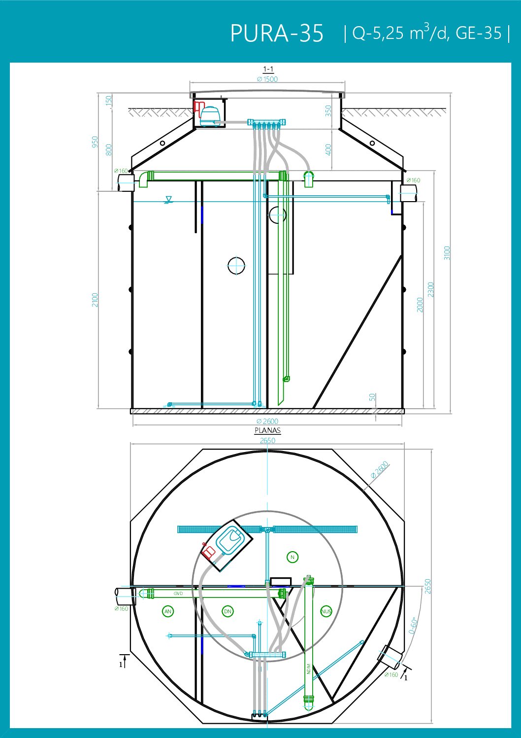 Buitinių nuotekų valymo įrenginys su orapūte ir orapūtine, skirtas 31-35 gyventojų